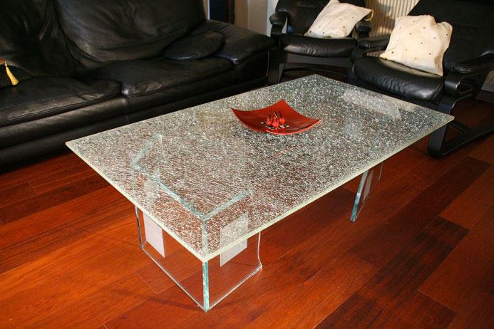 Table basse verre crash. Piétements verre collage UV.
